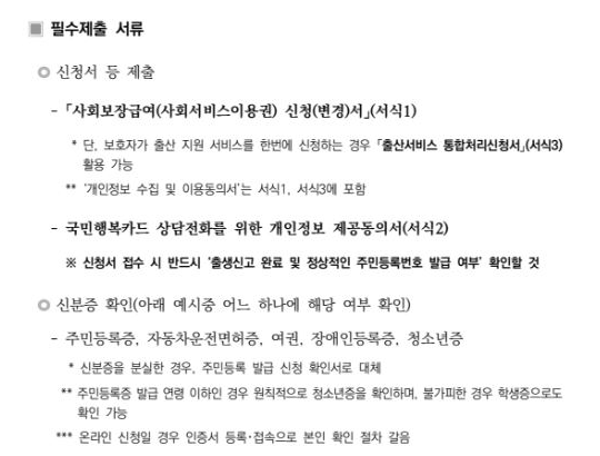 1) 본인신청 : 사회보장급여(사회서비스이용권) 신청(변경)서 또는 출산서비스 통합처리신청서, 신분증 확인